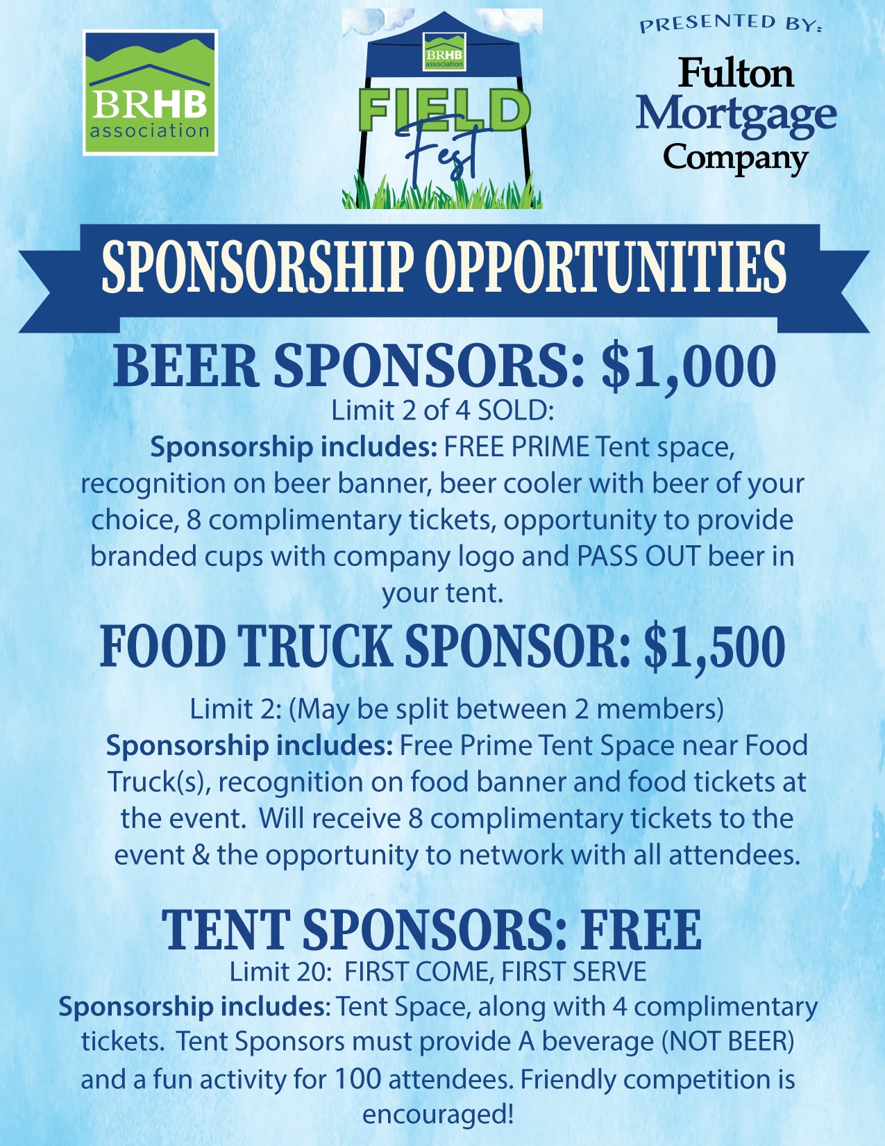 Introducing the BRHBA Field Fest, sponsored by Fulton Mortgage Company,** Formerly known as the BRHBA Builder Bash, this event is set for Friday, September 20, from 3:00 pm to 6:00 pm, **rain or shine**, at the Elks Lodge in Charlottesville.