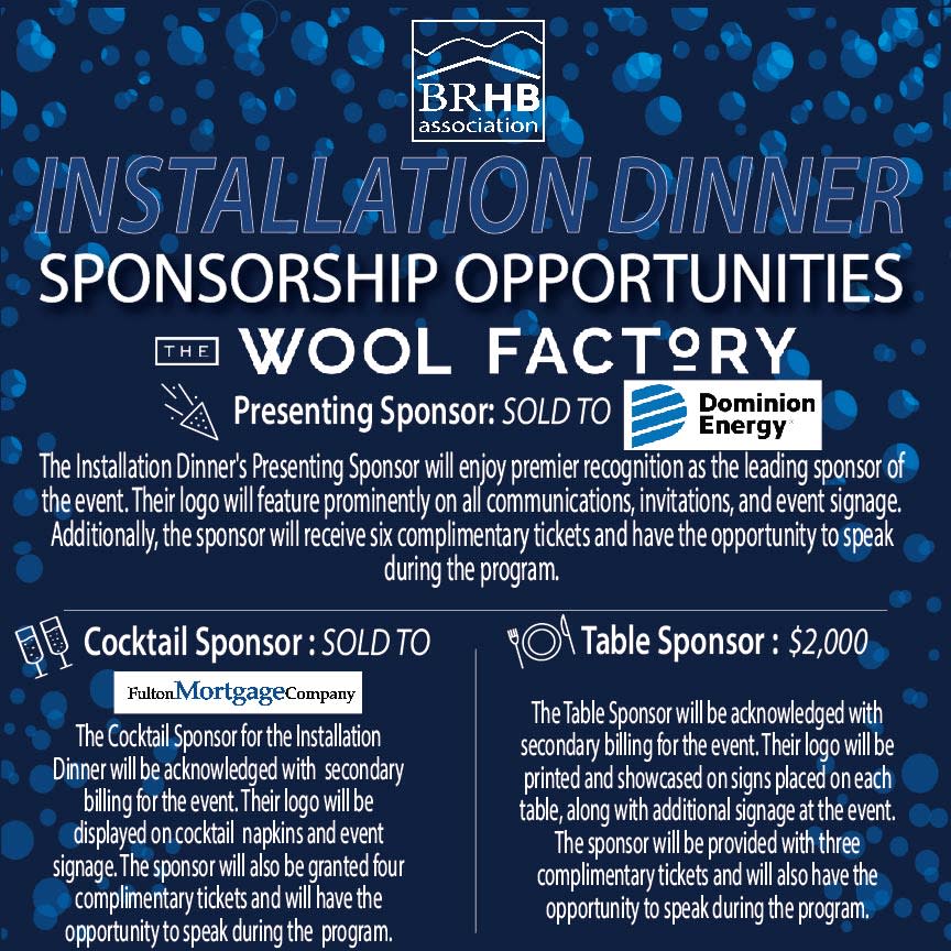 We invite you to join us for the inauguration of our 2025 Board of Directors and Executive Officers at our upcoming Installation Dinner, sponsored by Dominion Energy, with cocktails sponsored by Fulton Mortgage Company, on Thursday, January 23. The event will take place at the Wool Factory from 6:00 pm to 9:00 pm. This gathering provides a wonderful opportunity to connect, engage, and network with the most active members of our association. Come celebrate with us as we introduce and honor our new Board of Directors and Executive Officers! The evening kicks off with a cocktail hour at 6:00 pm, followed by dinner at 7:00 pm, and the program commencing at 8:00 pm. We look forward to celebrating this special occasion with you! We are actively seeking an additional sponsor or two to help us promote this event. If you are interested, please contact Jenny at the office for details.