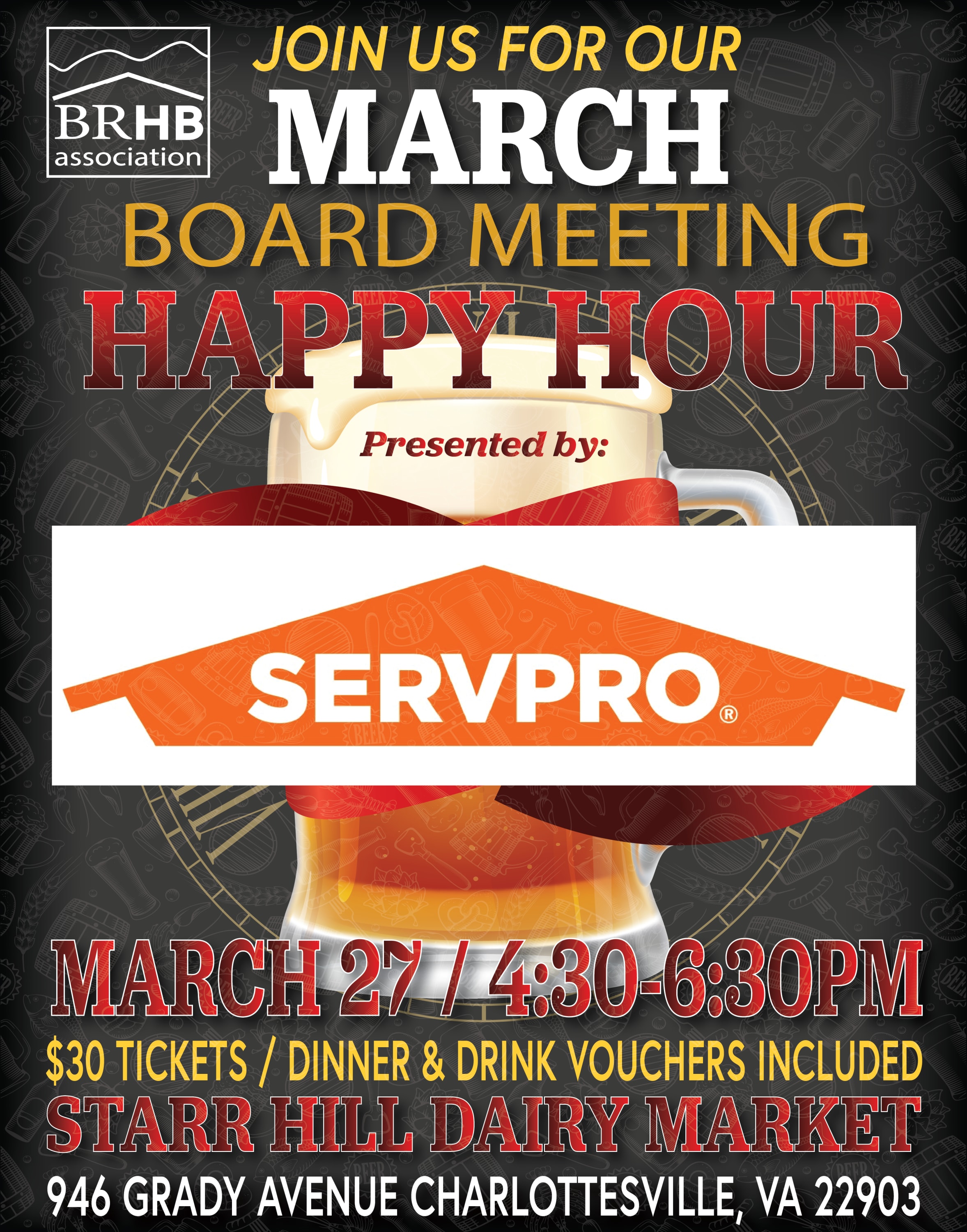 Take a break and join the Blue Ridge Home Builders Association for a relaxed evening of conversation and connection at our Board Meeting Happy Hour, sponsored by ServPro of Charlottesville, on Thursday, March 27th at Starr Hill Dairy Market.
