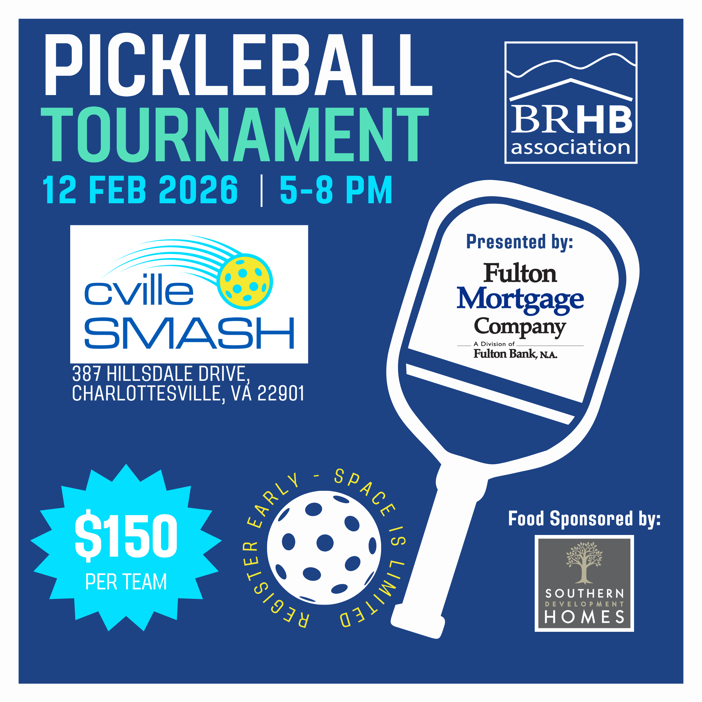 Get ready for some friendly competition on the courts! BRHBA is hosting our very first Pickleball Tournament, sponsored by Fulton Mortgage Company, with food sponsor Southern Development Homes, at SMASH Cville on Thursday, February 12 from 5–8 pm. We’ll kick things off with an hour dedicated to beginners and warmups, then dive into tournament play.