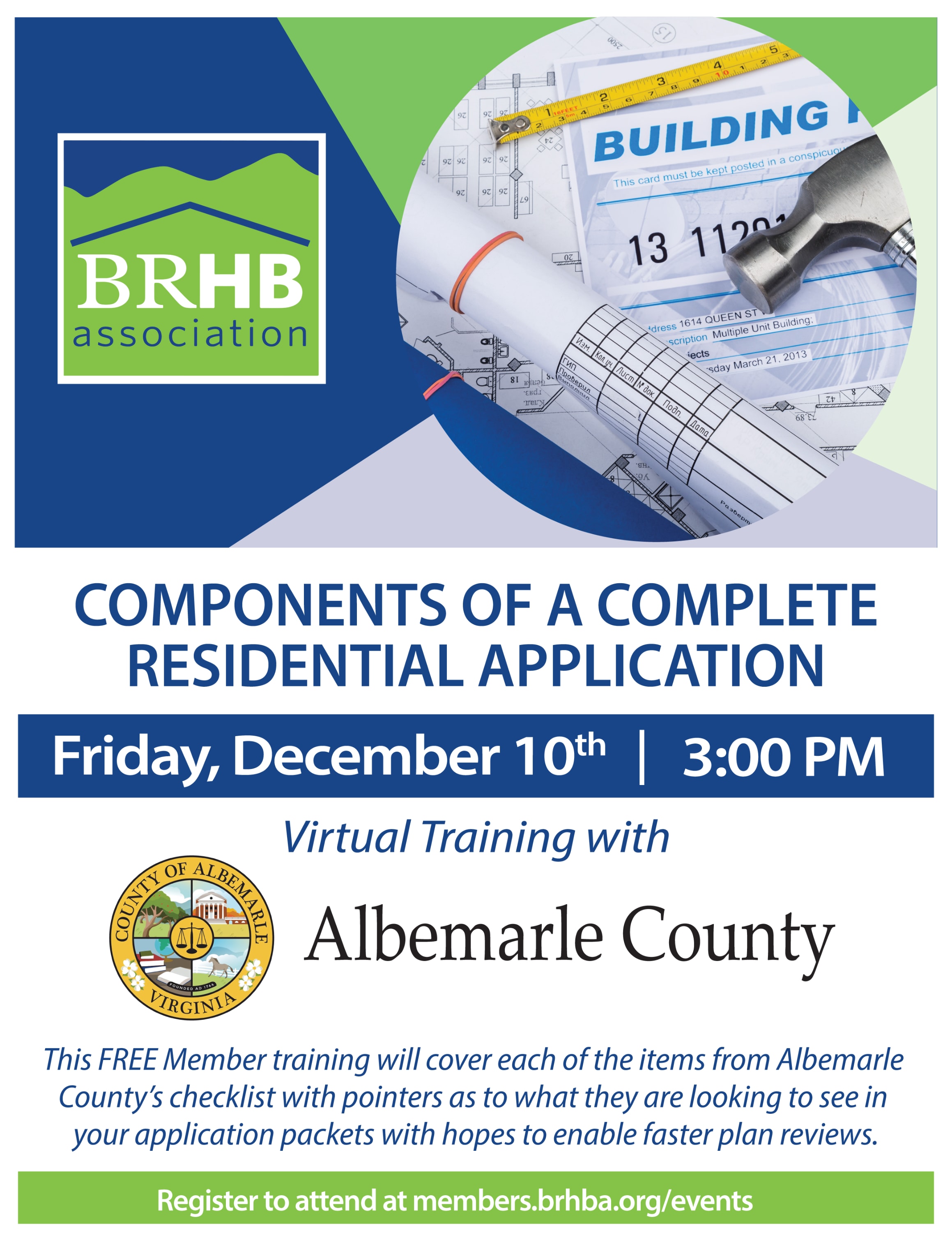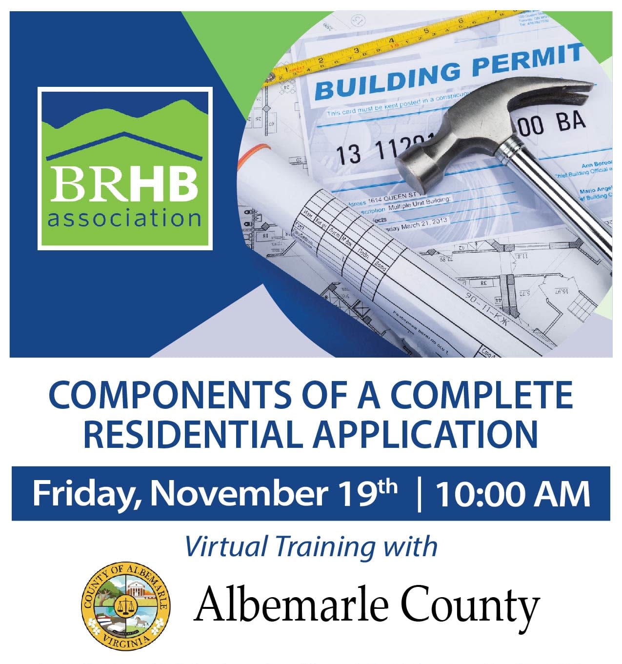 In an effort to enable faster plan reviews, Albemarle County has agreed to offer a FREE training for BRHBA Members on the Components of a Complete Residential Application. The training will cover each of the items from Albemarle County’s checklist. It will include pointers as to what they are looking to see in application packets to improve the plan review process. We hope you will make plans to join us virtually on December 10th.