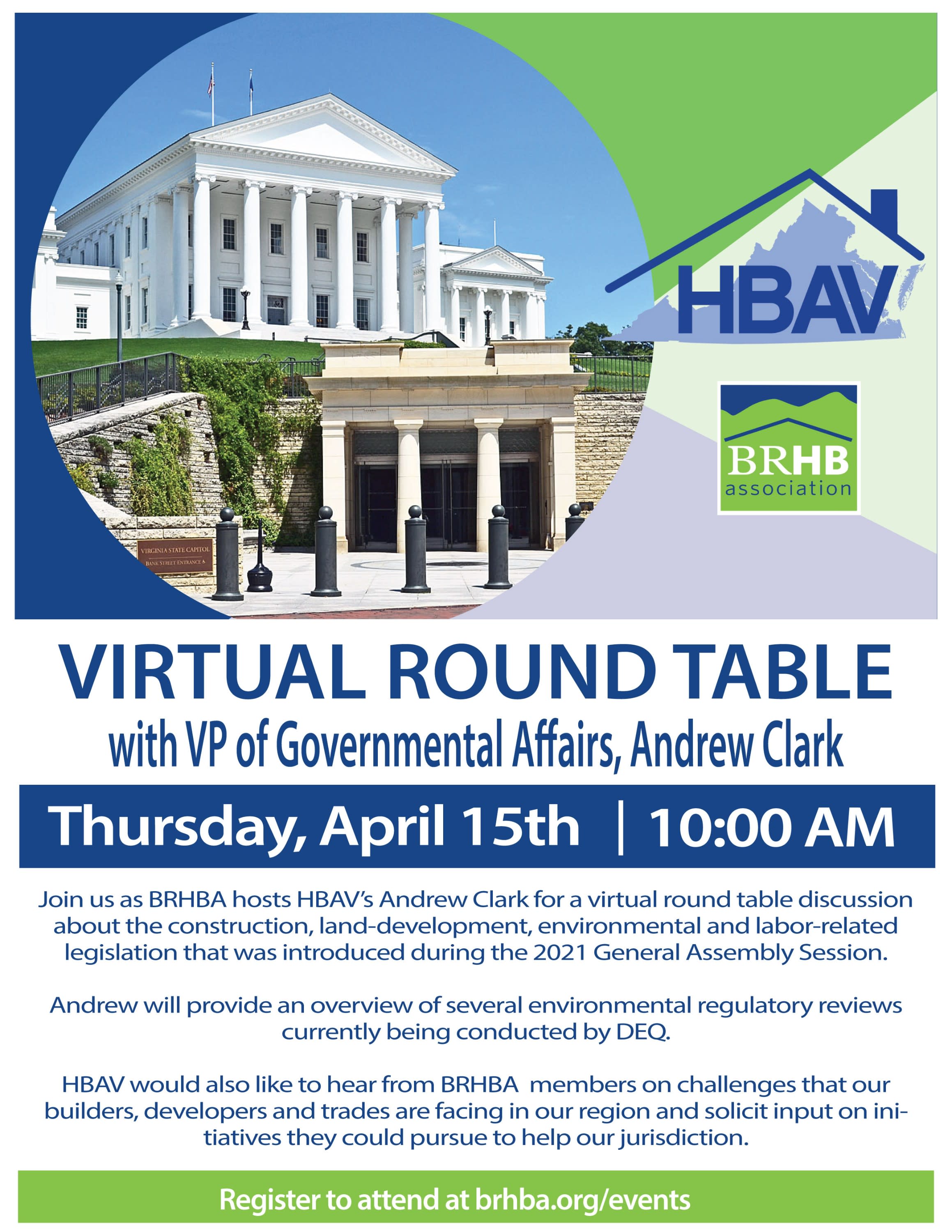 ** Canceled ** Join BRHBA as we host HBAV's Andrew Clark for a virtual round table discussion about the construction, land-development, environmental and labor-related legislation that was introduced during the 2021 General Assembly Session. HBAV would also like to hear from BRHBA members about the challenges that builders, developers and trades are facing in our region and solicit input on initiatives they could pursue to help our jurisdiction.