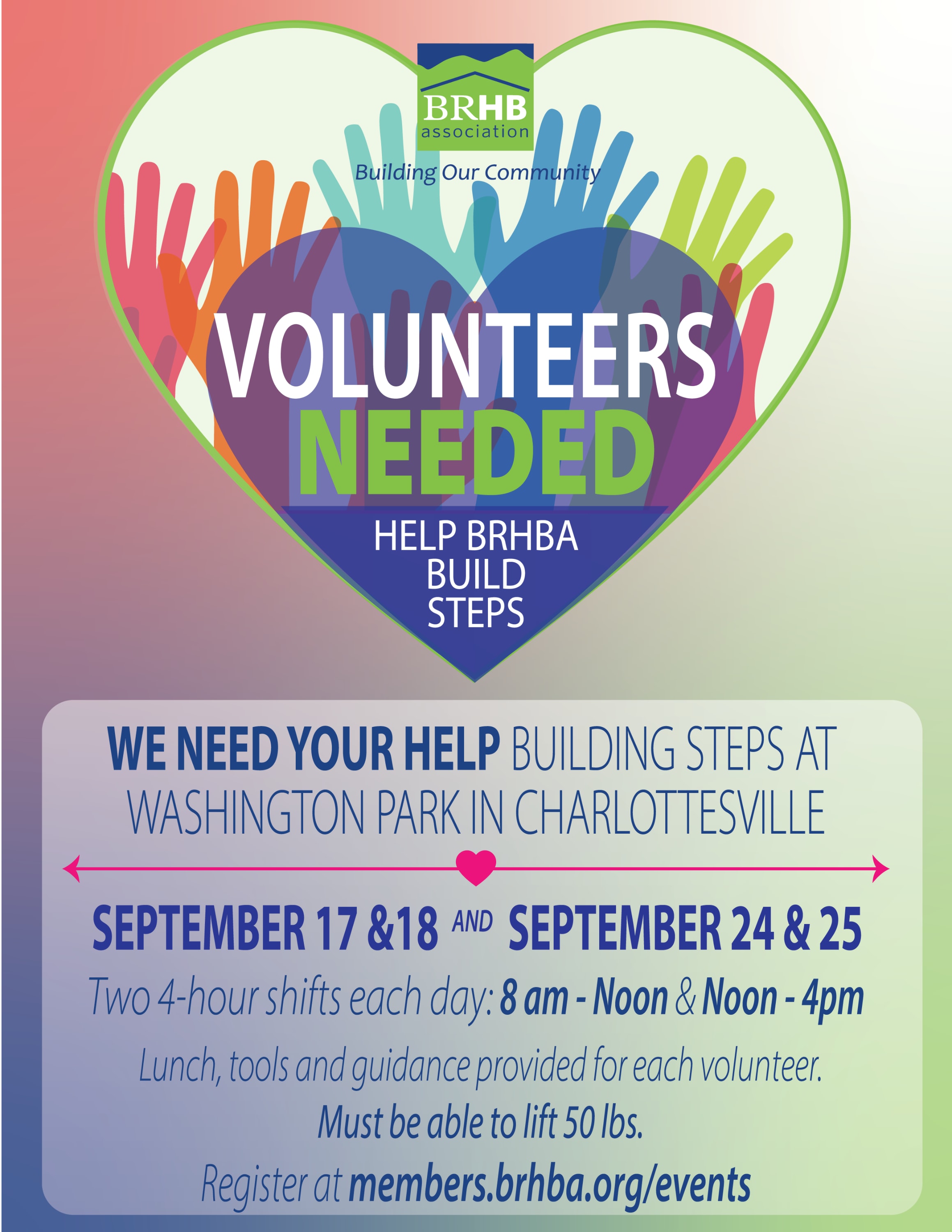 Help BRHBA Members re-build the steps at Washington Park in Charlottesville in a four-day volunteer project. There will be 12 volunteer slots available per 4-hour shift each day. Choose your time slot (8 am - Noon OR Noon - 4pm), then your duty on the sign-up genius link below. Lunch, tools and guidance will be provided on site for all volunteers. You MUST be able to lift 50 lbs in order to volunteer during this project.