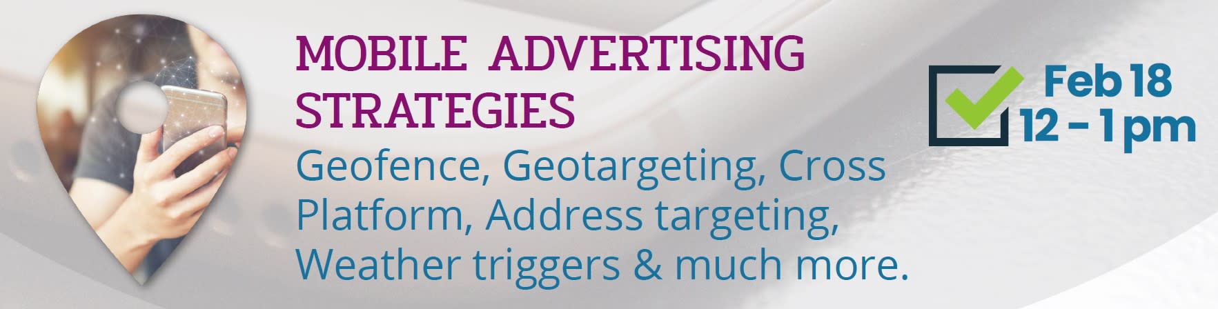 Mobile Marketing: The Latest and Greatest Innovations (30 minutes) Learn all the features of mobile marketing including geo-fencing, Household Address Targeting, behavioral/location/brand targeting, dynamically updated ads, weather triggered ads, geo-retargeting, geo-lookalike targeting, Audience DNA, and visit tracking. If you’re new to mobile, or a mobile marketing enthusiast, there’s a topic in this webinar for you!Images